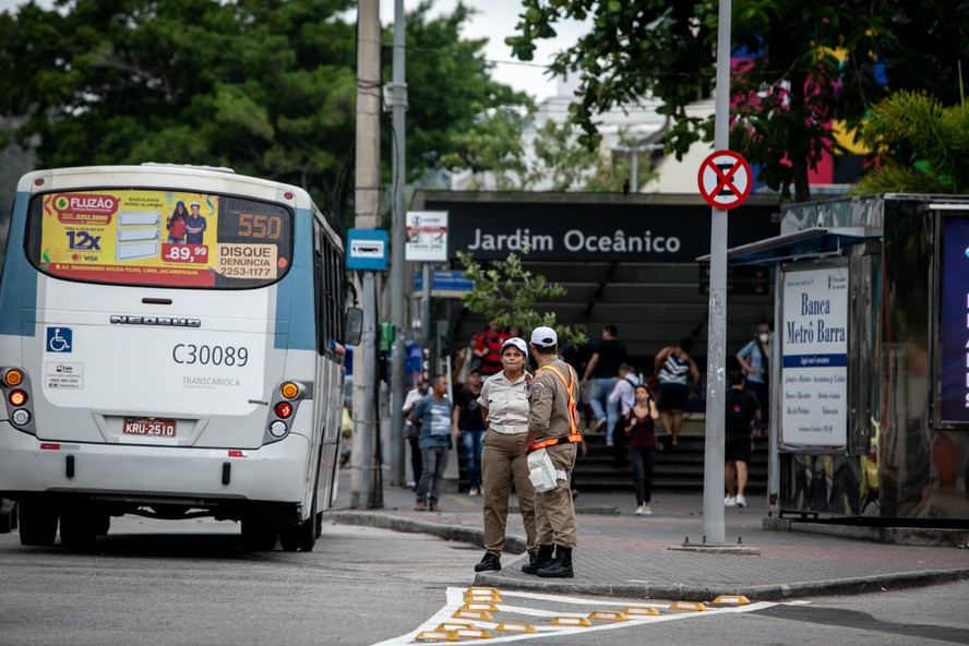 Guardas municipais nas imediações da estação do metrô na Barra — Foto: Brenno Carvalho / Agência O Globo/04-05-2022