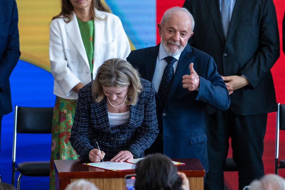 O presidente da República,Luiz Inácio Lula da Silva,dá posse à nova ministra da Secretaria de Relações Institucionais da Presidência da República,no Palácio do Planalto. — Foto: Brenno Carvalho / Agência O Globo