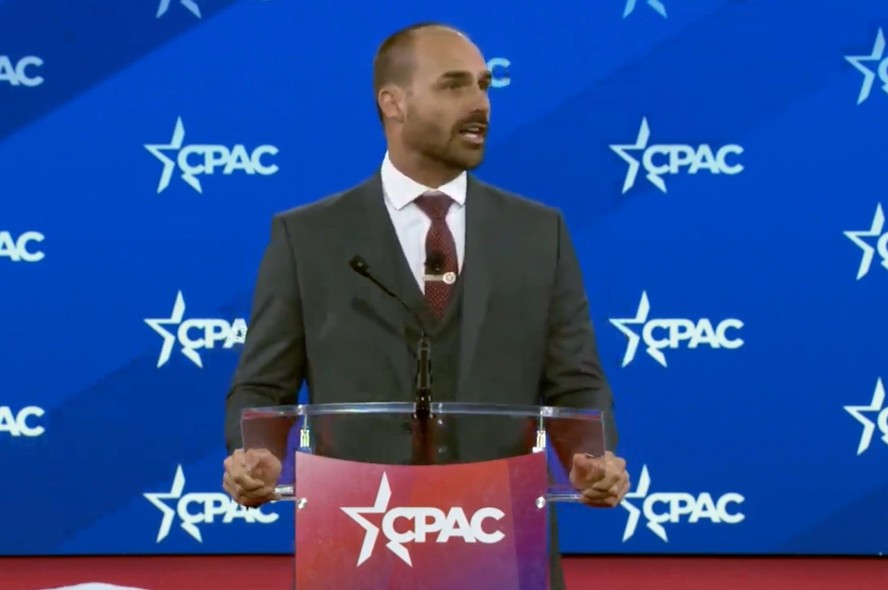 Eduardo Bolsonaro em evento conservador nos Estados Unidos — Foto: reprodução / youtube CPAC RESUMOSem tempo? Ferramenta de IA resume para você