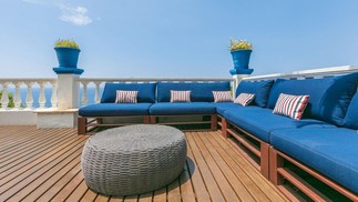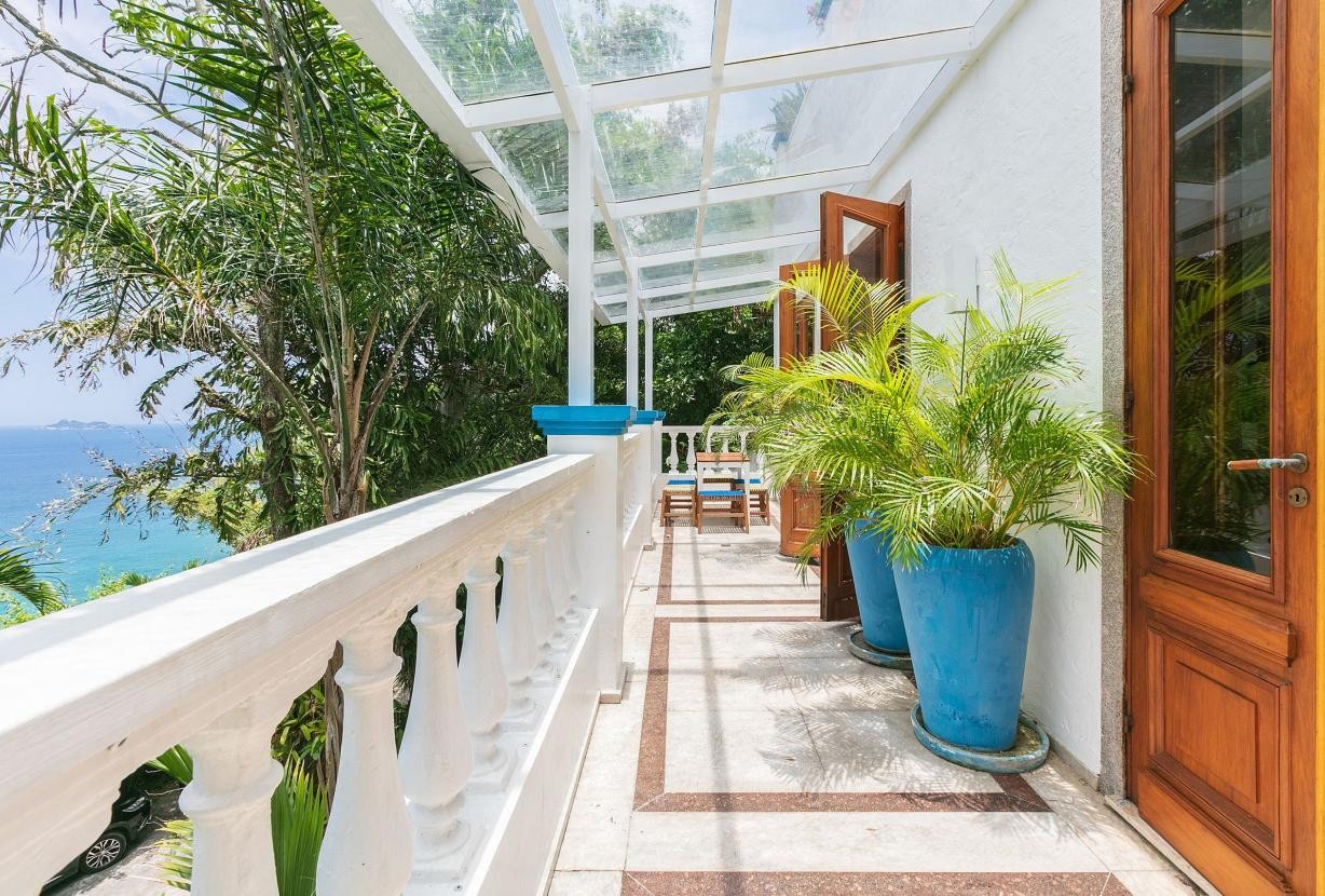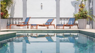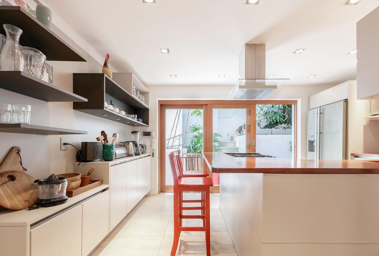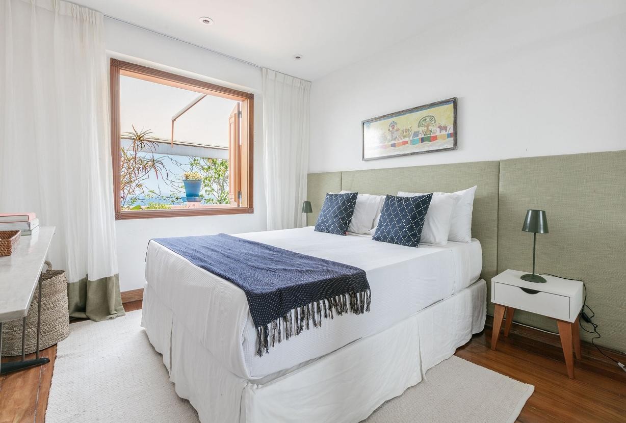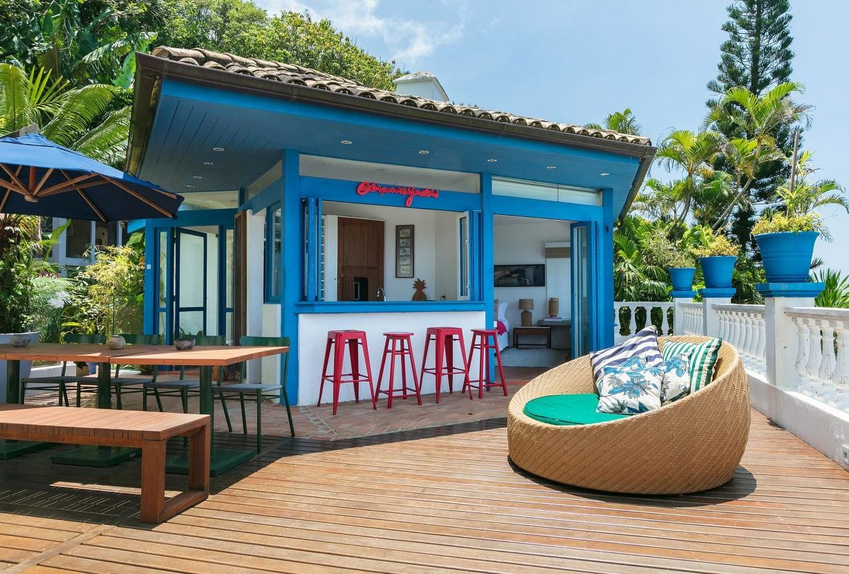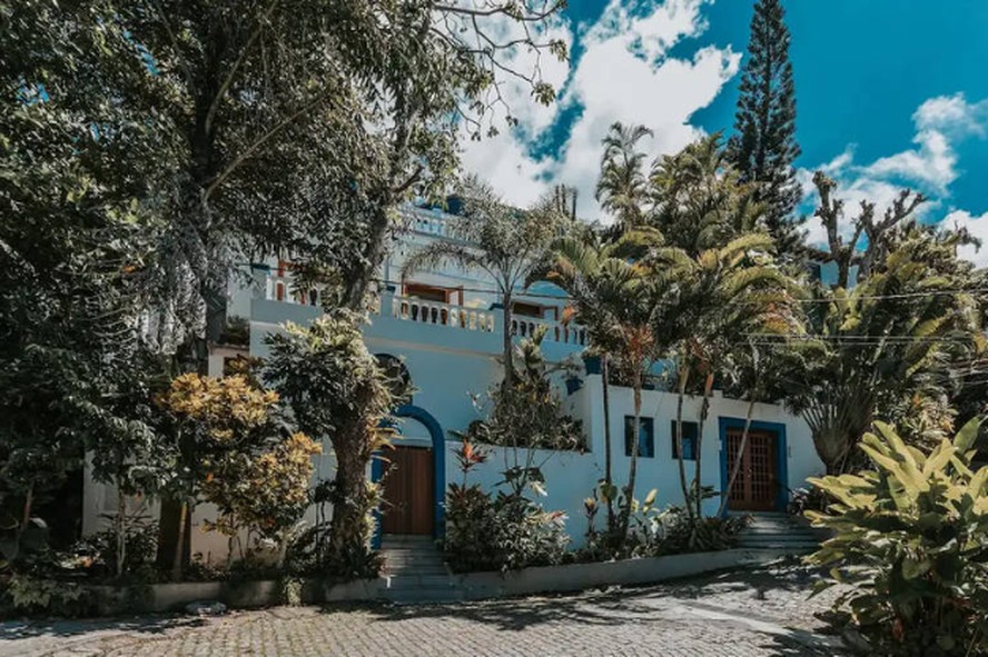A casa tem 350 m² e tem características dos anos 1950 com portas altas e janelas de madeira. A fachada é azul e branco e,dentro,segue uma paleta mais neutra. São três quartos,uma suíte,sala de estar,banheiro,lavabo,piscina,sauna seca e deque com vista para a praia. No terraço do último andar,há uma suíte de casal adicional com chuveiro e sauna.