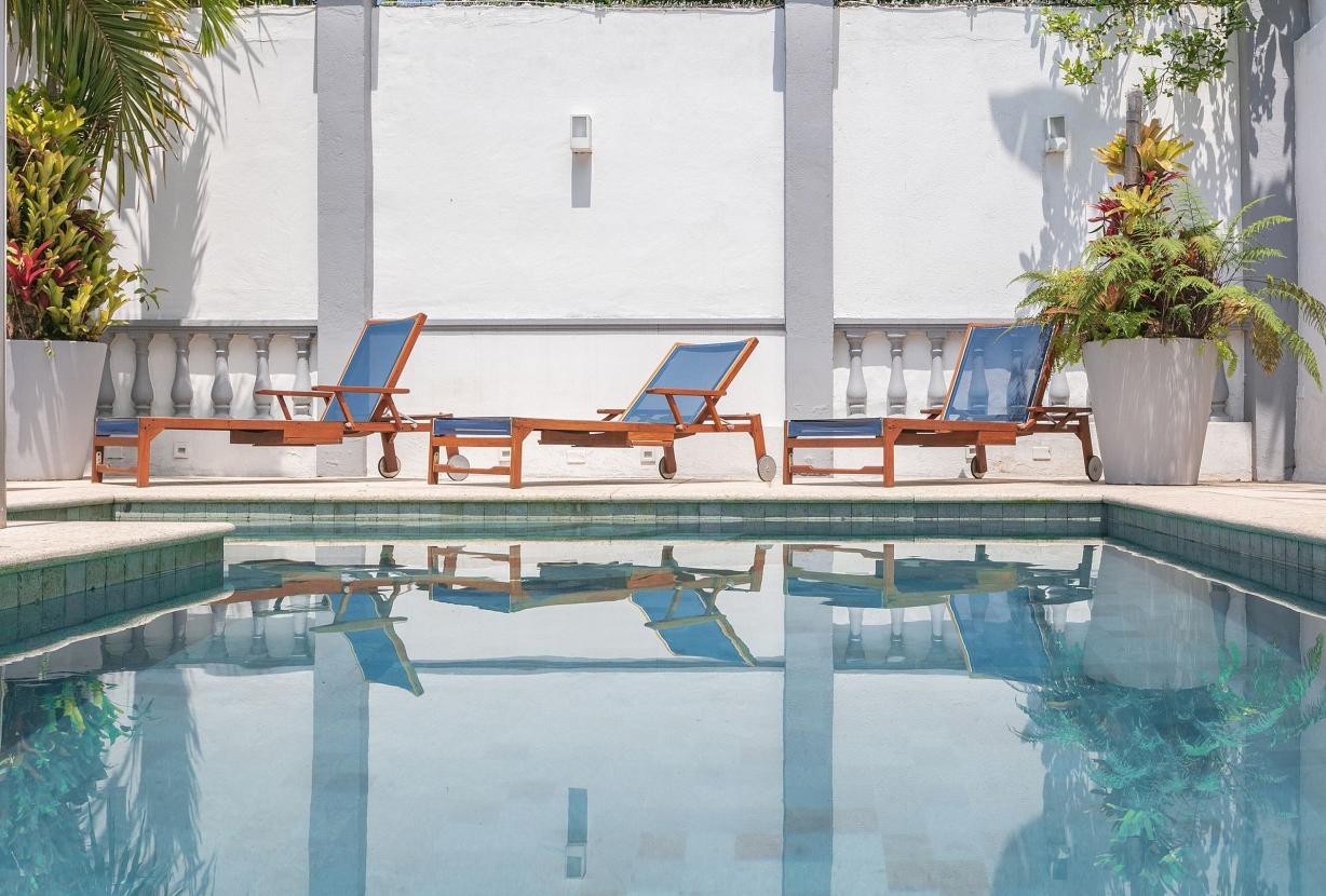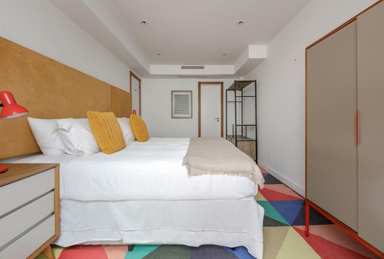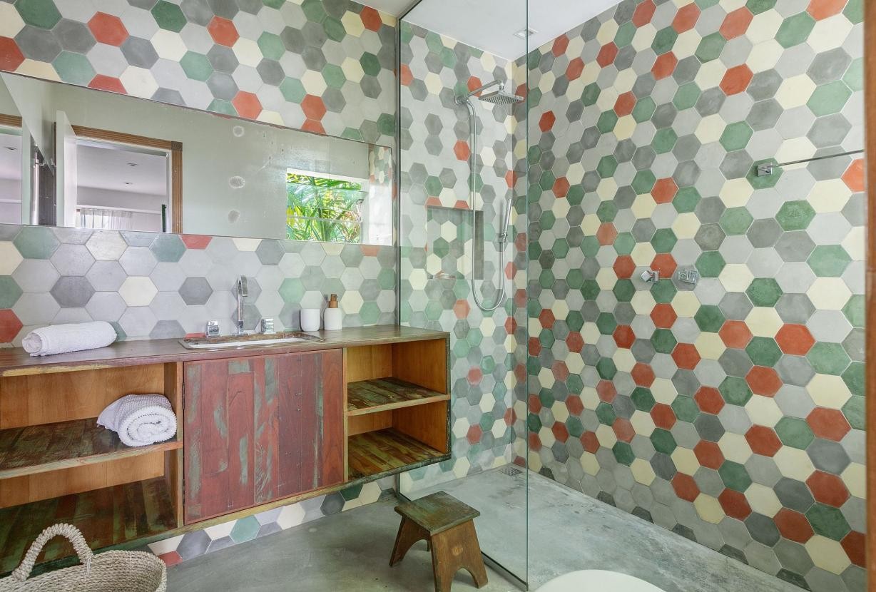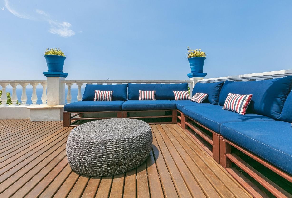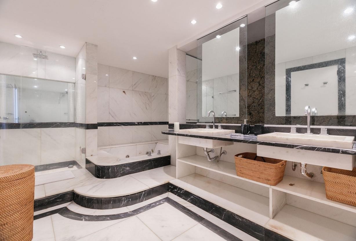A casa tem 350 m² e tem características dos anos 1950 com portas altas e janelas de madeira. A fachada é azul e branco e,dentro,segue uma paleta mais neutra. São três quartos,uma suíte,sala de estar,banheiro,lavabo,piscina,sauna seca e deque com vista para a praia. No terraço do último andar,há uma suíte de casal adicional com chuveiro e sauna.