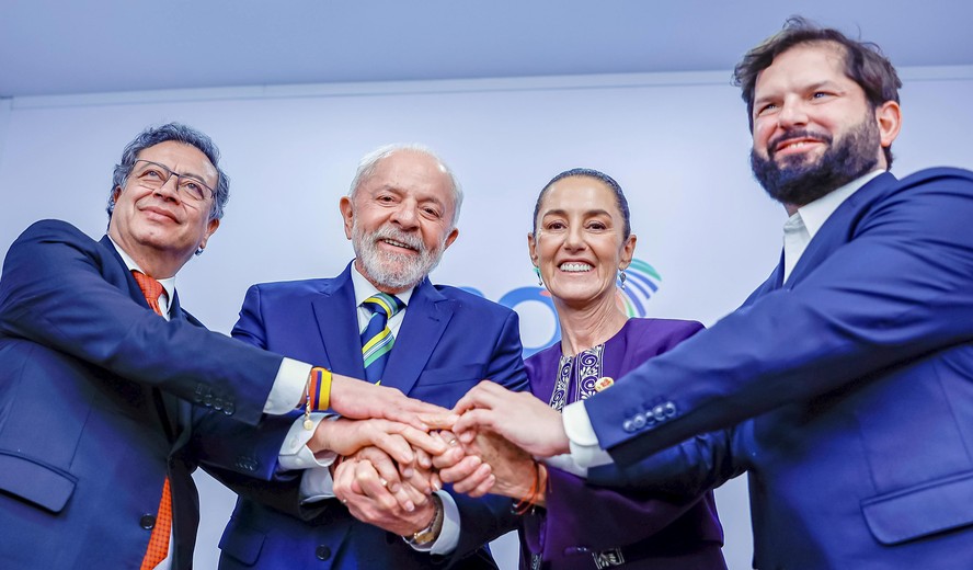 Presidente Luiz Inácio Lula da Silva com Gustavo Petro,presidente da Colômbia (E); Claudia Sheinbaum,presidente do México,e Gabriel Boric,presidente do Chile (D),durante a Cúpula de Líderes do G
