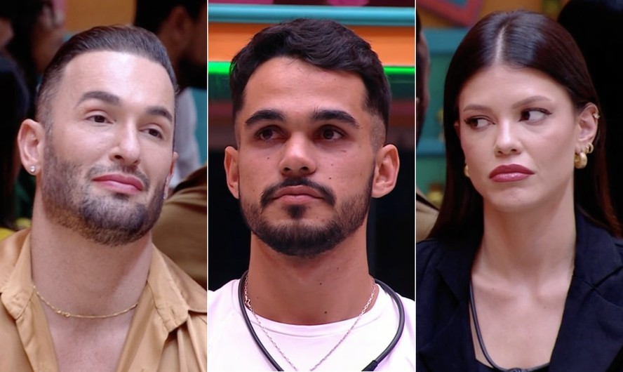 Da esquerda para a direita,Diego Hypolito,João Gabriel e Vitória Strada: participantes do BBB 25 estão no paredão desta semana — Foto: Reprodução/TV Globo