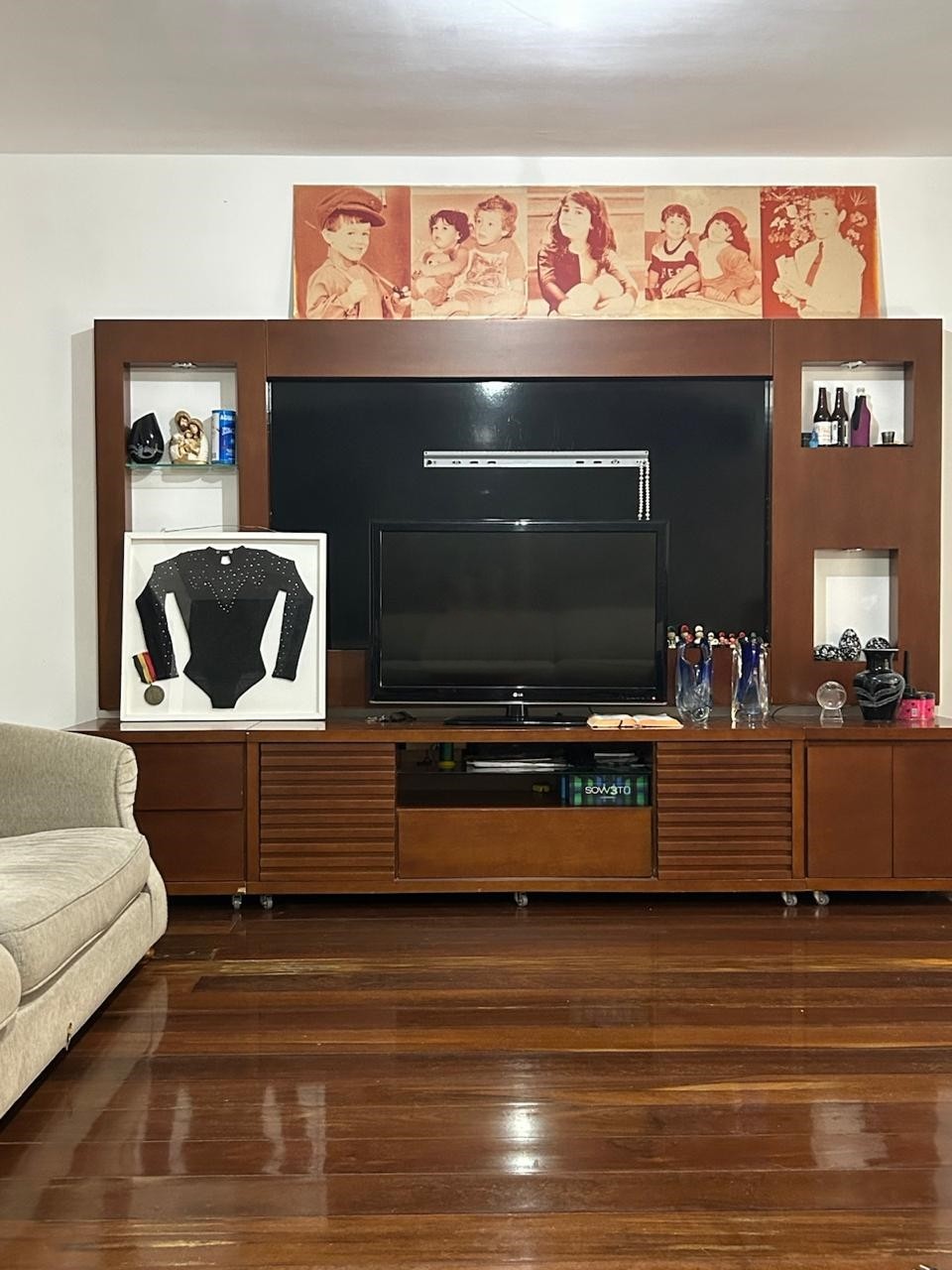 Sala da casa de Diego Hypolito,que mora com os pais no Rio de Janeiro. Há fotografias e collant de Daniele Hypolito — Foto: Divulgação