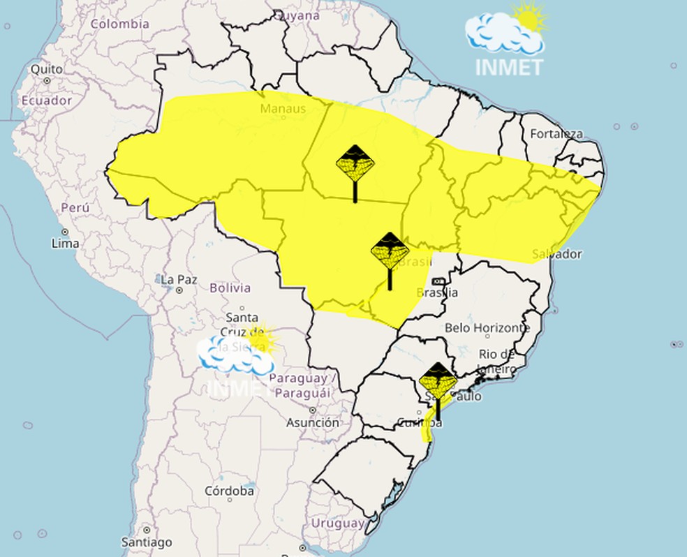 Os três avisos amarelos,de "perigo potencial" para chuvas intensas,atingem as regiões Norte,Nordeste,parte do Centro-Oeste e litoral de Santa Catarina,Paraná e São Paulo. Segundo o Inmet,as precipitações podem chegar a 50 mm/dia,com ventos de até 60 km/h.