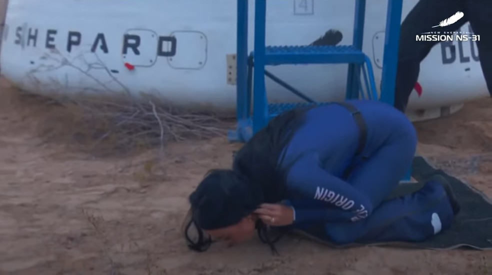 Assim que saiu da cápsula,a estrela pop estendeu a flor e logo beijou o chão de terra de um terreno inóspito no Texas. Katy era o nome mais conhecido de um grupo formado apenas por mulheres alcançaram a "borda do espaço sideral" — a chamada Linha de Kármán — na manhã de hoje,voando rumo ao cosmos em um dos foguetes de Bezos.
