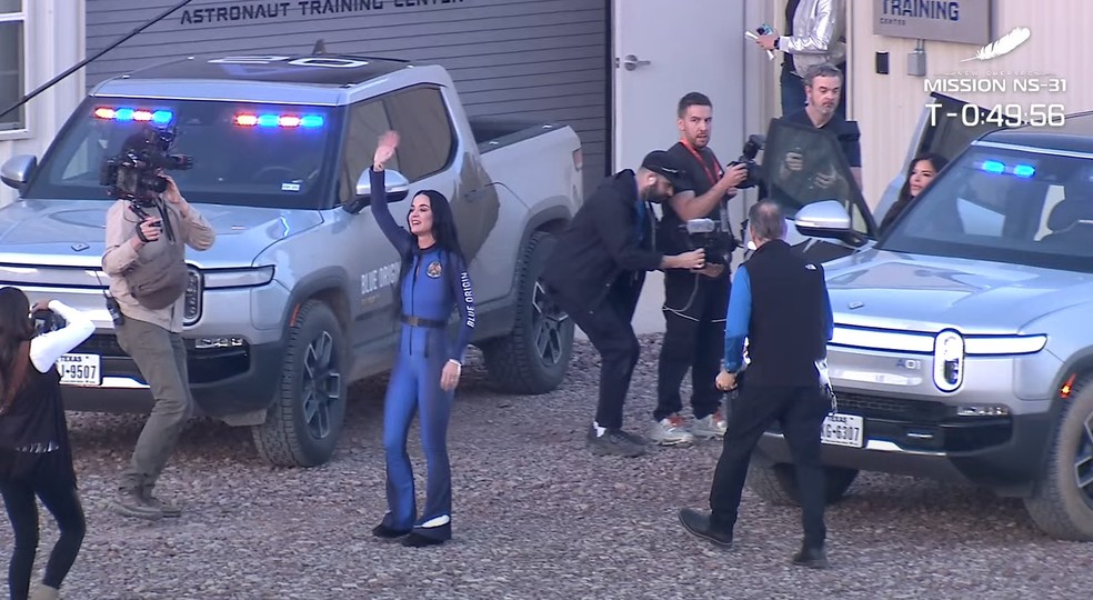 Katy Perry acena para fãs e amigos antes de embarcar em foguete rumo a viagem espacial — Foto: Reprodução/YouTube