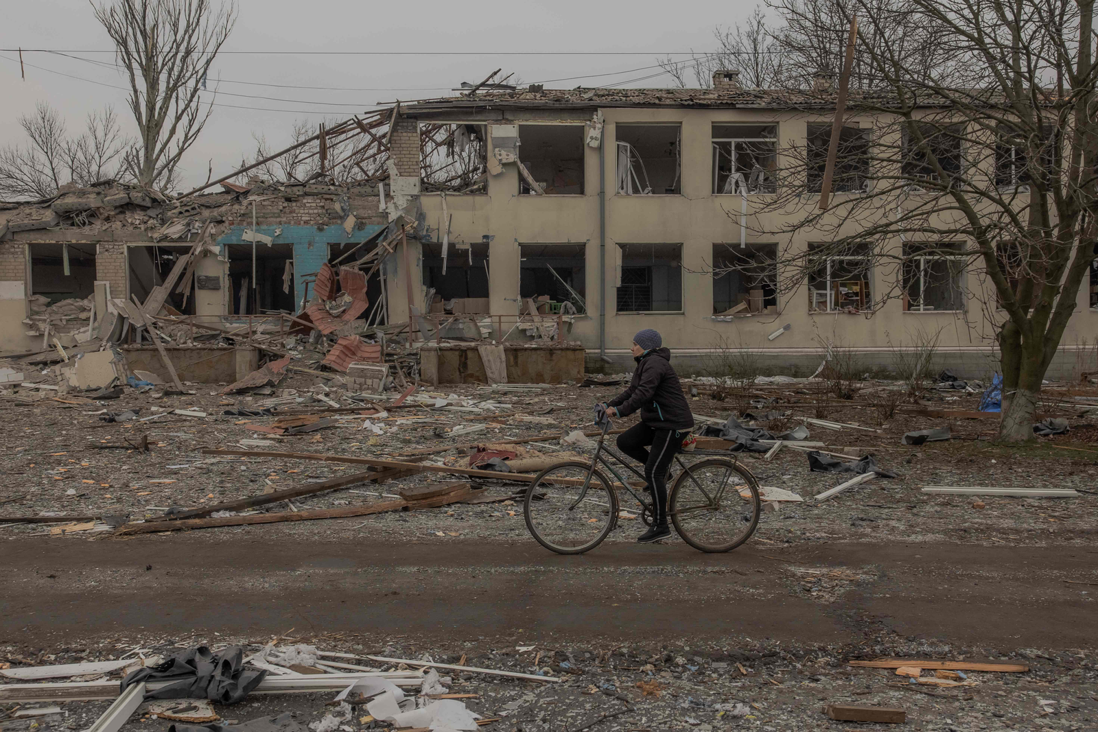 Mulher andando de bicicleta em meio a destroços após bombardeio na vila Novopavlivka,na Ucrânia — Foto: Roman PILIPEY / AFP