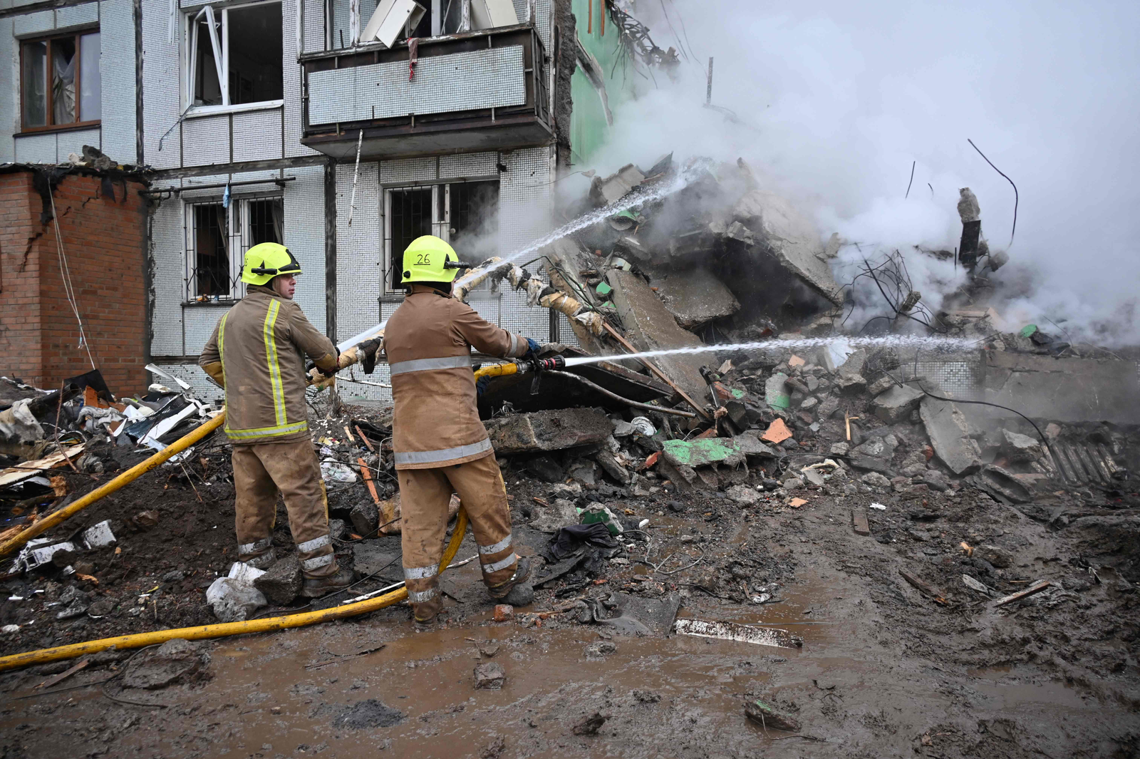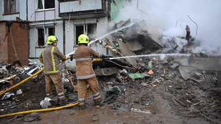 Bombeiros apagando incêndio em prédio após ser atingido por míssil,em Poltava,na Ucrânia — Foto: Sergey Bobok / AFP