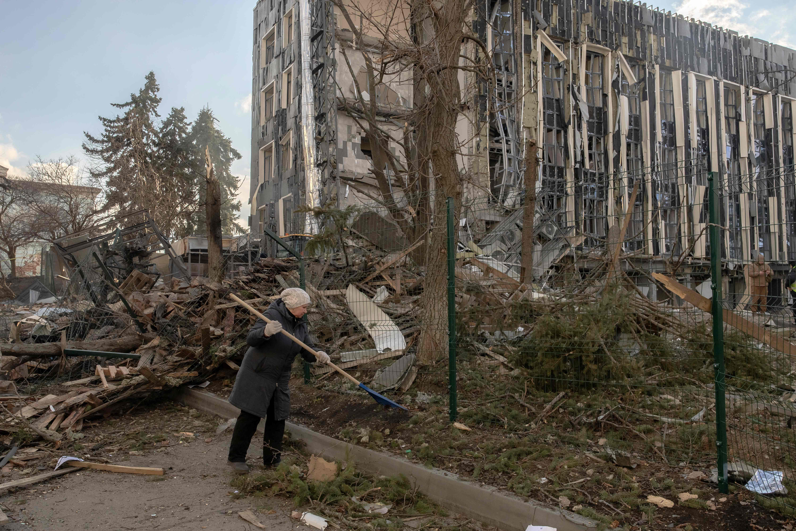 Mulher limpando destroços de prédio após ataque de míssil em Izyum,na região de Kharkiv na Ucrânia — Foto: Roman Pilipey / AFP