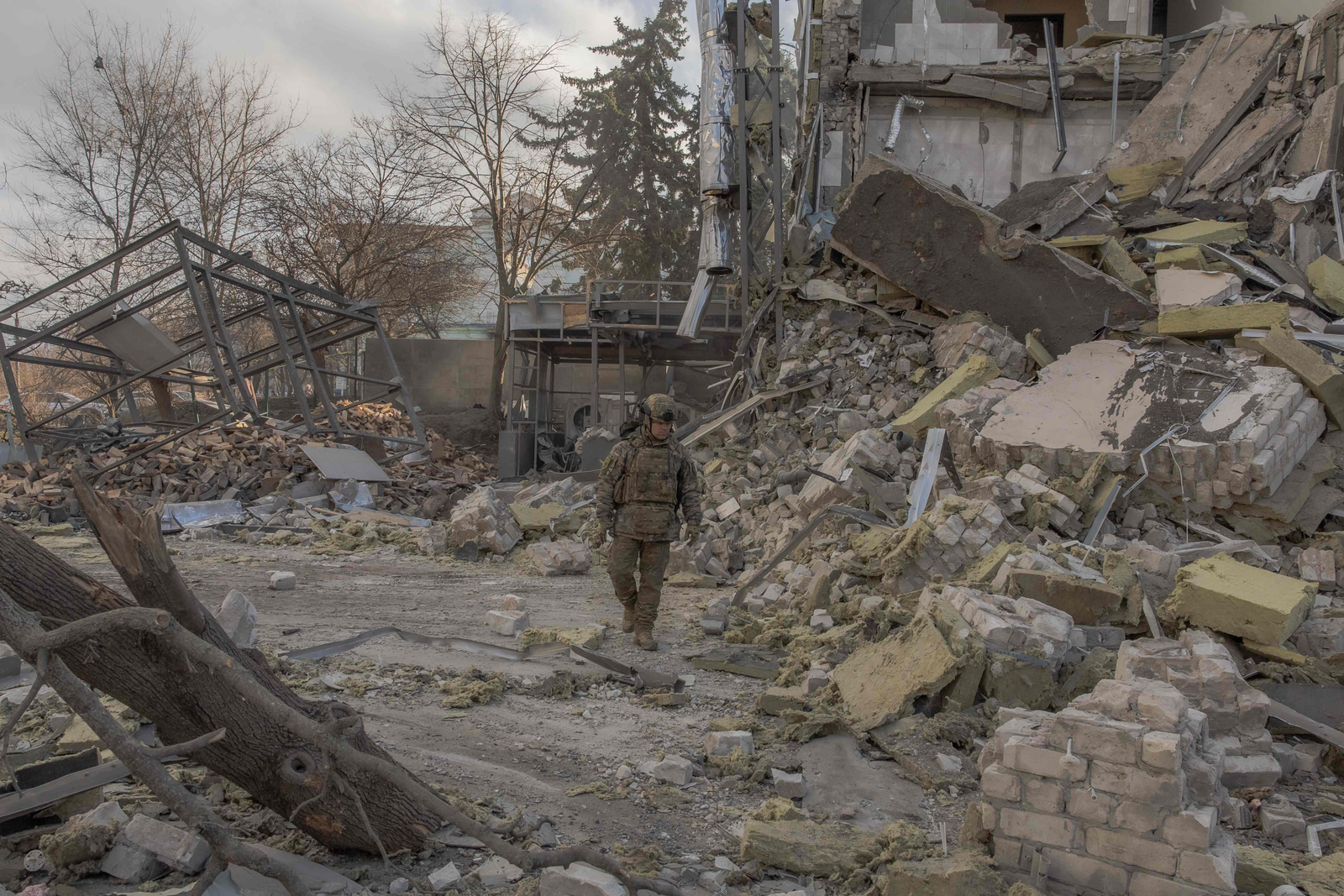 Militar ucraniano em meio aos destroços de prédio,após ataque de míssil em Izyum,na Ucrânia — Foto: Roman PILIPEY / AFP