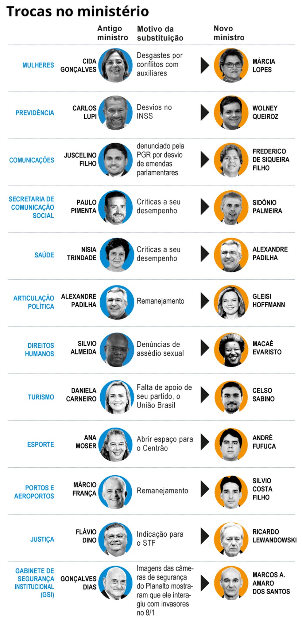 Trocas no Ministério: infográfico mostra histórico de mudanças no governo Lula — Foto: Arte O Globo