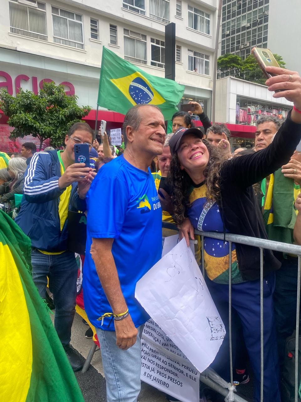 Valdemar Costa Neto posa com apoiadora no ato da Avenida Paulista — Foto: Aline Ribeiro/ Agência O Globo