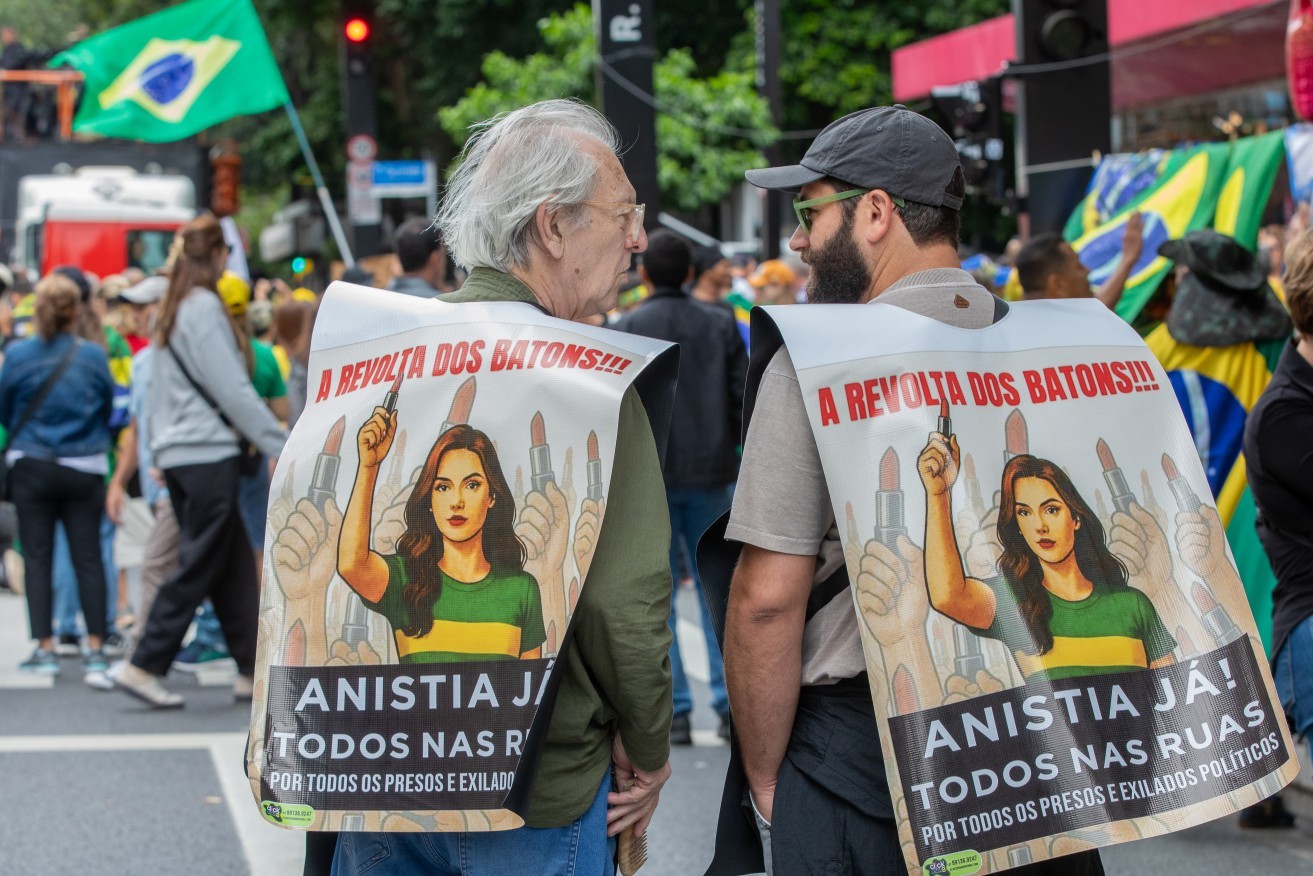 Batom vira símbolo no ato pró-anistia,fazendo referência ao caso da cabeleireira Débora Rodrigues,que usou o objeto para pichar a estátua do STF — Foto: Edilson Dantas / Agência O Globo