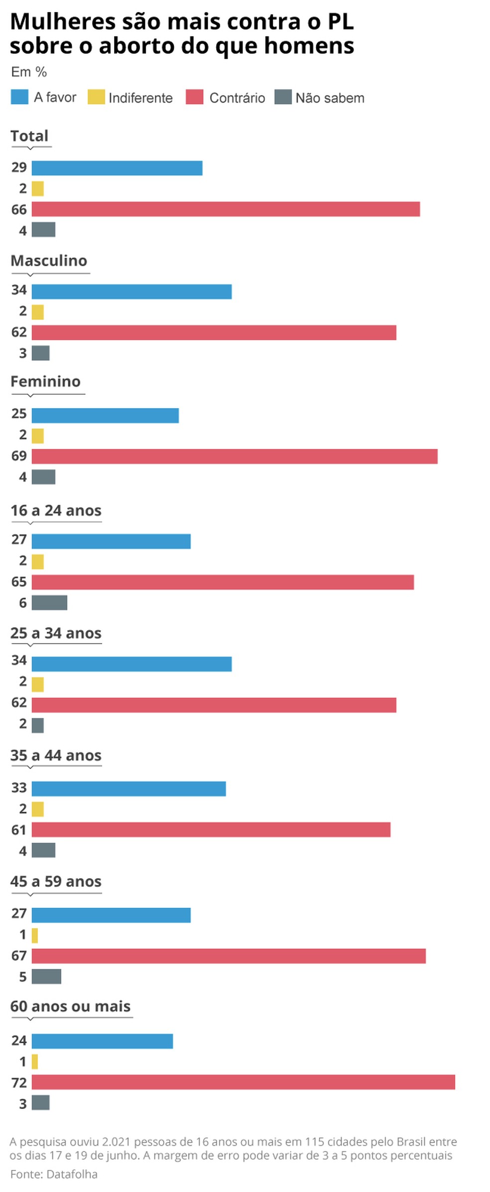 A pesquisa aponta que 69% das mulheres e 62% dos homens afirmam ser contra o PL 1.904,do deputado Sóstenes Cavalcante (PL-RJ),enquanto 34% dos homens e 25% das mulheres apoiaram a iniciativa. A urgência da medida foi aprovada a toque de caixa na quarta-feira passada na Casa Legislativa.