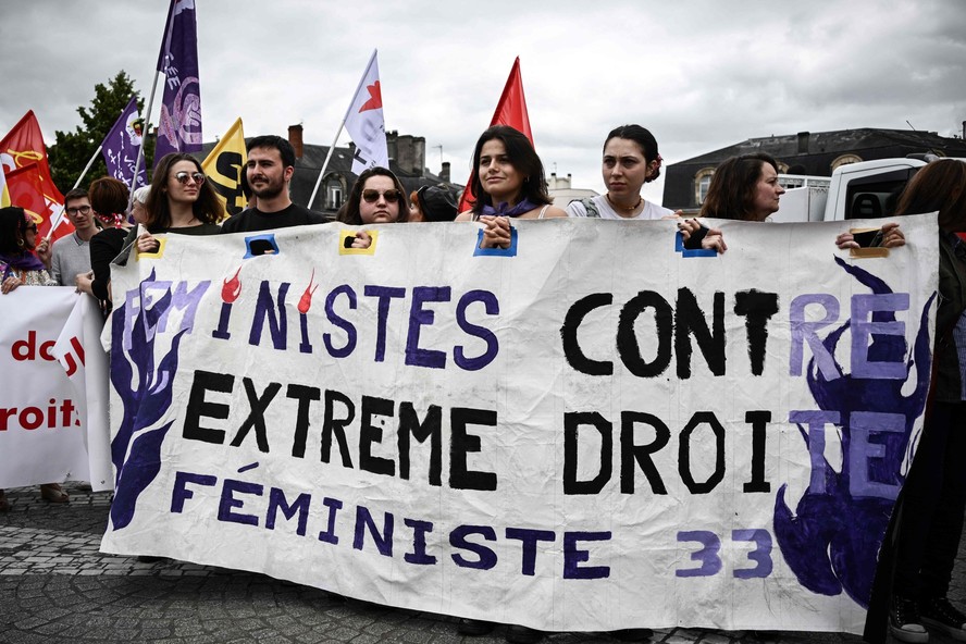 A apenas uma semana do primeiro turno das eleições legislativas na França,milhares de pessoas foram às ruas neste domingo protestar contra a extrema direita,denunciando o perigo do partido Reagrupamento Nacional (RN) para os direitos das mulheres. A manifestação acontece no momento em que o RN — que lidera as pesquisas de intenção de voto — atrai cada vez mais o eleitorado feminino,após esforços de moderação da sua líder política,Marine Le Pen.