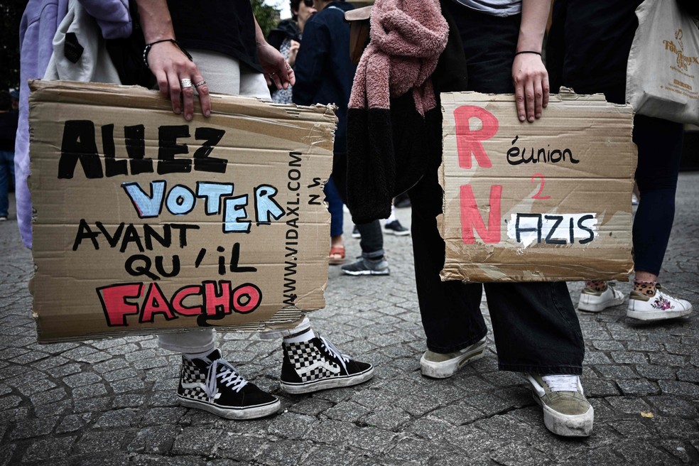 Contexto: Após convocar eleições antecipadas,Macron pede união de moderados contra 'extremos' na FrançaHá uma semana: Milhares de pessoas protestam contra a extrema direita na França
