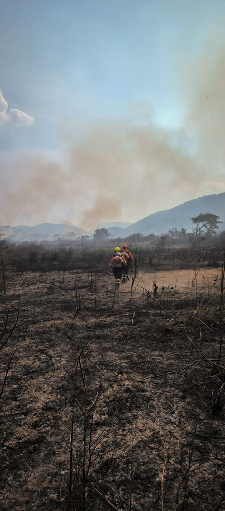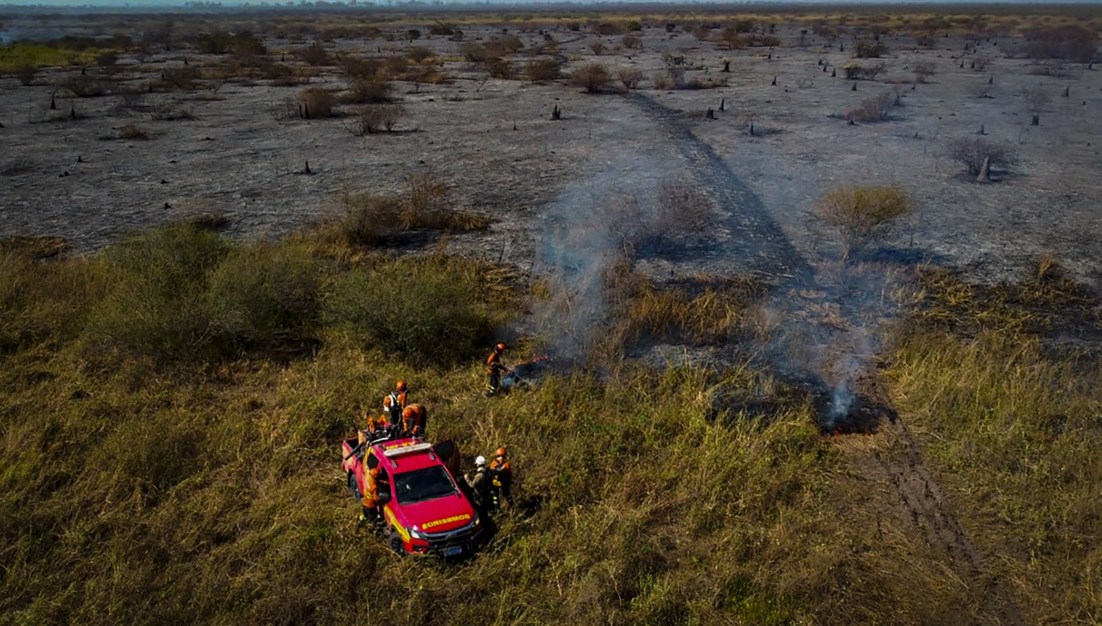 Foto divulgada pelo Corpo de Bombeiros de Mato Grosso do Sul mostra bombeiros fiscalizando uma área queimada por um incêndio florestal no Bioma Pantanal,no estado de Mato Grosso do Sul — Foto: Handout / MATO GROSSO FIREFIGHTERS DEPARTMENT / AFP