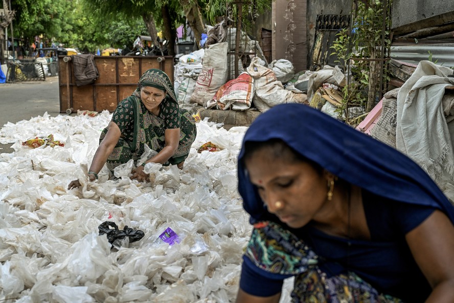 Hansa Ahir (E),que comprou uma apólice de seguro para cobrir sua renda em dias em que o calor torna perigoso trabalhar,recupera resíduos recicláveis em Ahmedabad,Índia,em junho de 2024 — Foto: A