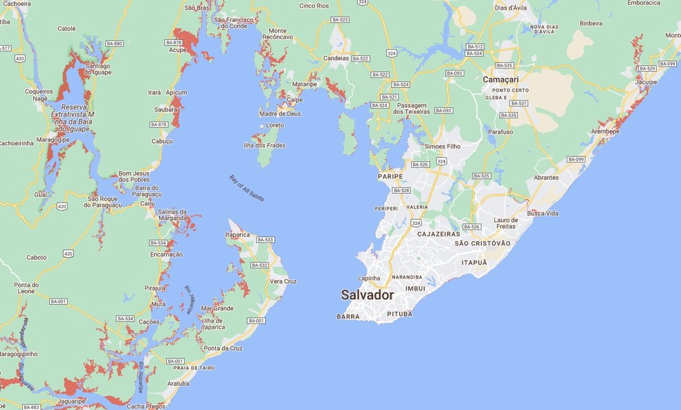 Áreas afetadas em Salvador — Foto: Climate Central