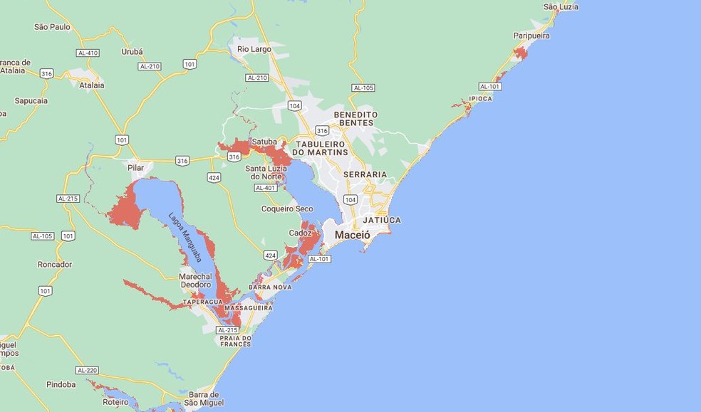 Áreas afetadas em Maceió — Foto: Climate Central