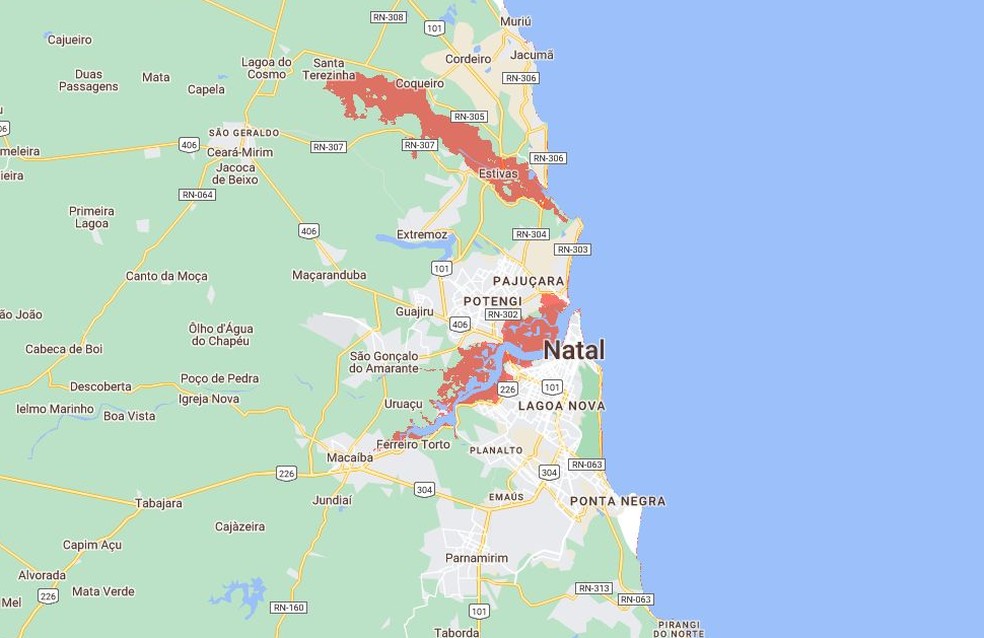 Áreas afetadas em Natal — Foto: Climate Central