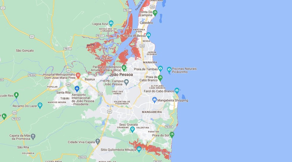 Áreas afetadas em João Pessoa — Foto: Climate Central