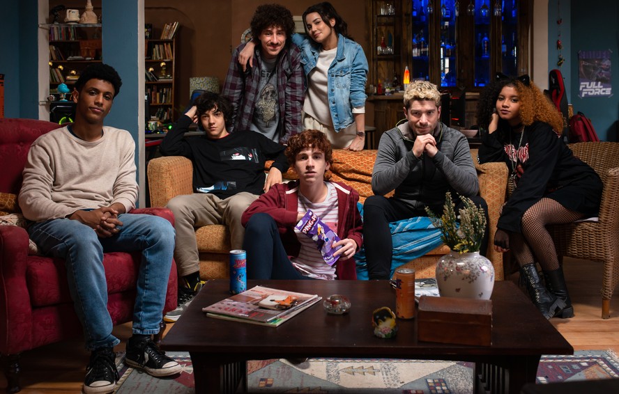Rafa (Caio Cabral),Daniel (Cauã Martins),Patos (Erik Vesch) e Ana Paula (Nanda Marques),Ike (Luige Montez),Gui (Thiago Prade) e Kami (Laura Luz) — Foto: Fabio Rebelo