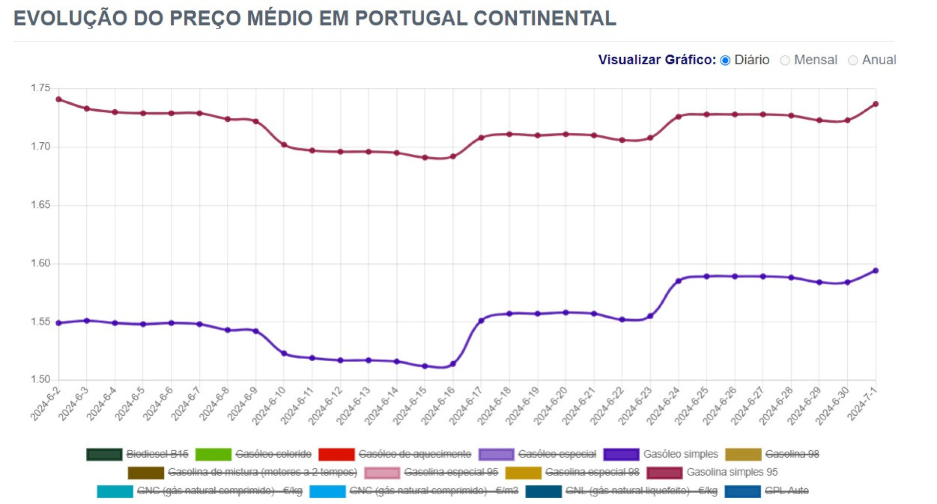 A Direção Geral de Energia e Geologia (DGEG) indicou nesse mesmo dia que o preço médio do litro de gasolina em Portugal custava 1,727 euros/litro enquanto o do gasóleo simples valia 1,588 euros.