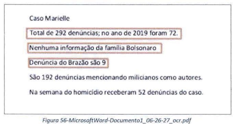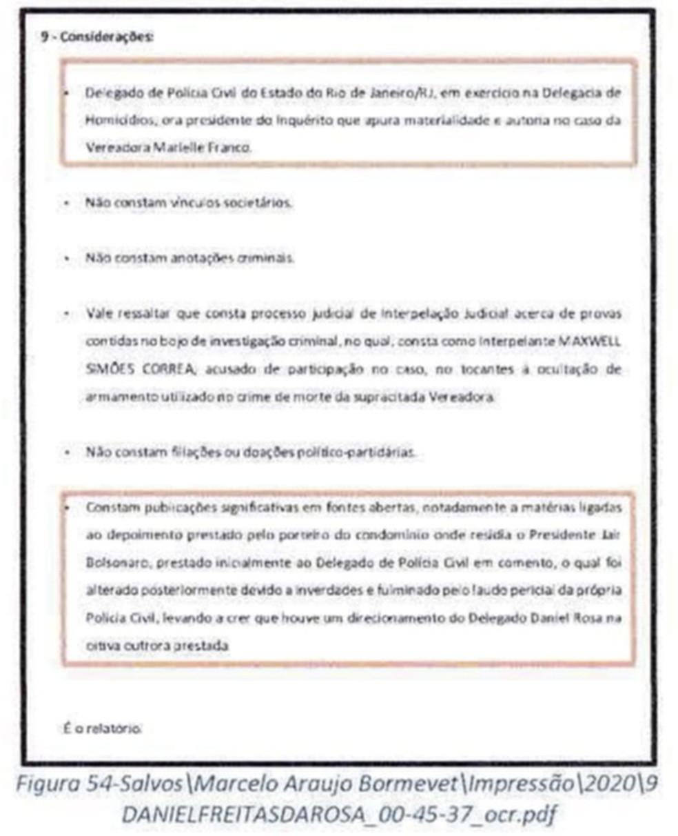 “Constam publicações significativas em fontes abertas,notadamente a matérias ligadas ao depoimento prestado pelo porteiro do condomínio onde residia o presidente Jair Bolsonaro,prestado inicialmente ao delegado da Polícia Civil em comento,o qual foi alterado posteriormente devido a inverdades e fulminado pelo laudo da própria Polícia Civil,levando a crer que houve um direcionamento do delegado Daniel Rosa na oitiva outrora prestada”,diz o relatório.