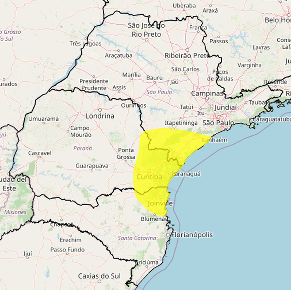 O instituto também alertou 'perigo potencial' para chuvas intensas em São Paulo,Paraná e Santa Catarina. O aviso é válido da madrugada desta terça-feira até às 10h. O órgão explica que as chuvas nas cidades atingidas podem variar entre 20 mm/h e 30 mm/h,com possibilidade de chegar até 50 mm/dia,além do risco de ventos intensos entre 40 km/h e 60 km/h.