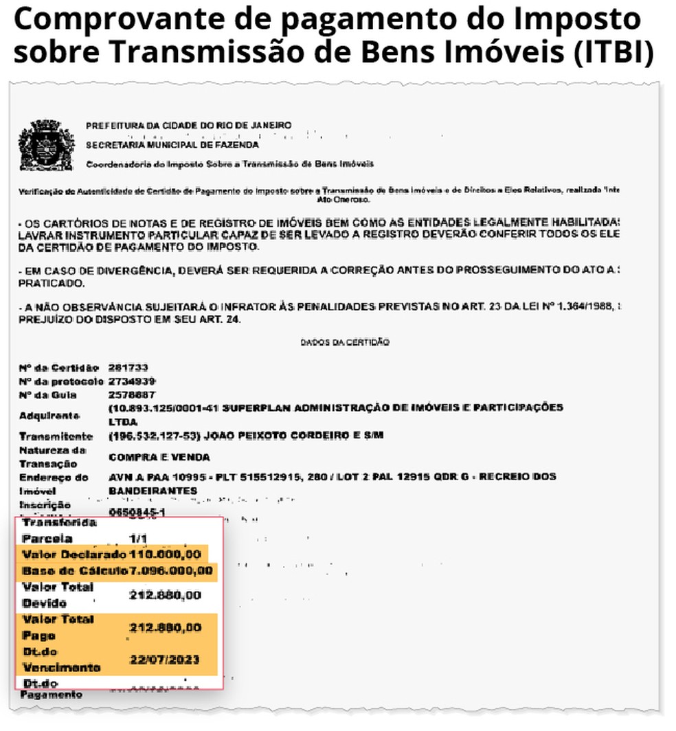 Comprovante de ITBI mostra que terreno foi vendido por R$ 110 mil e cálculo de imposto baseou-se no valor de R$ 7 milhões,conforme a prefeitura — Foto: Reprodução