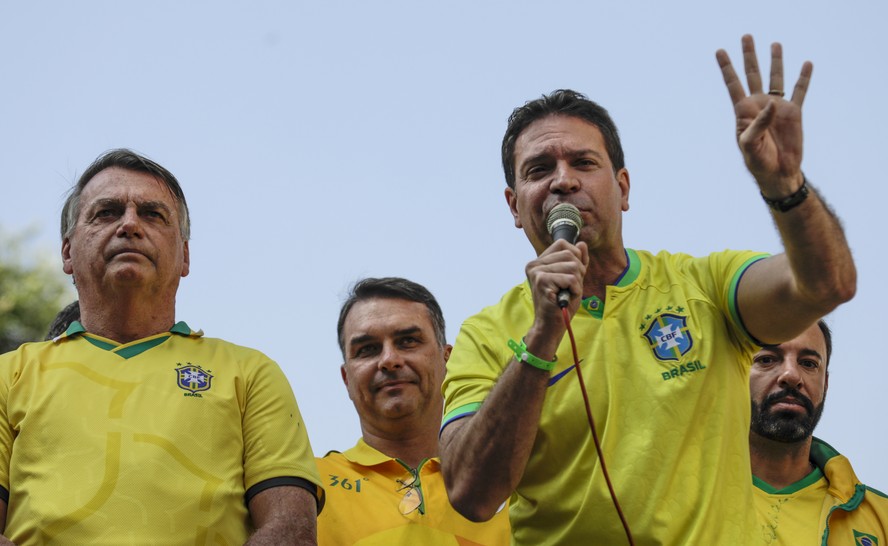 Bolsonaro participa de evento na praça Saens Pena,na Tijuca (RJ),ao lado de Alexandre Ramagem,pré-candidato à prefeitura do Rio — Foto: Gabriel de Paiva / Agência O Globo