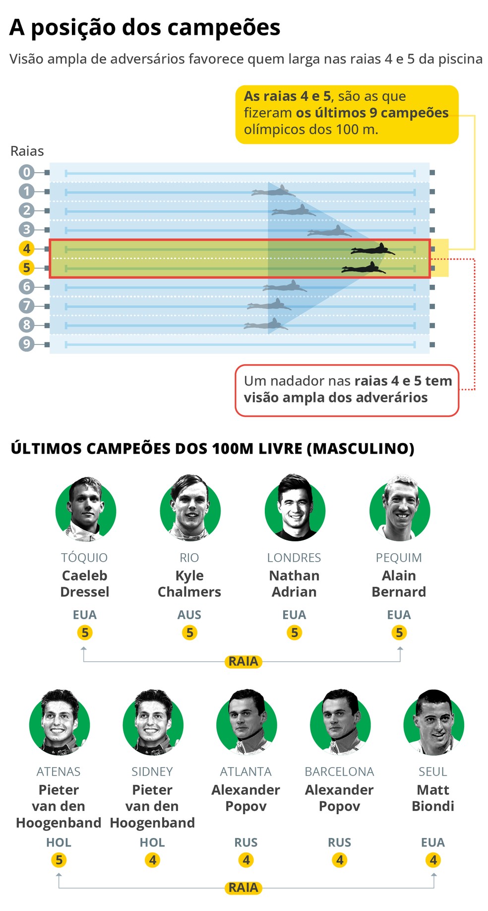 Ao menos é o que o histórico da prova aponta. Principalmente na disputa entre os homens. Todos os últimos cinco campeões olímpicos nos 100m livre nadaram a final na raia 5. Esta sequência interrompeu outra. Entre Seul-1988 e Sidney-2000,os vencedores saíram da 4. Ou seja: depois de Los Angeles-1984,com o americano Rowdy Gaines partindo da 3,o ouro só saiu para nadadores posicionados nas raias centrais.