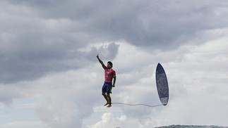 Gabriel Medina comemora a melhor onda surfada dos Jogos de Paris,até o momento — Foto: Jerome Brouillet/AFP