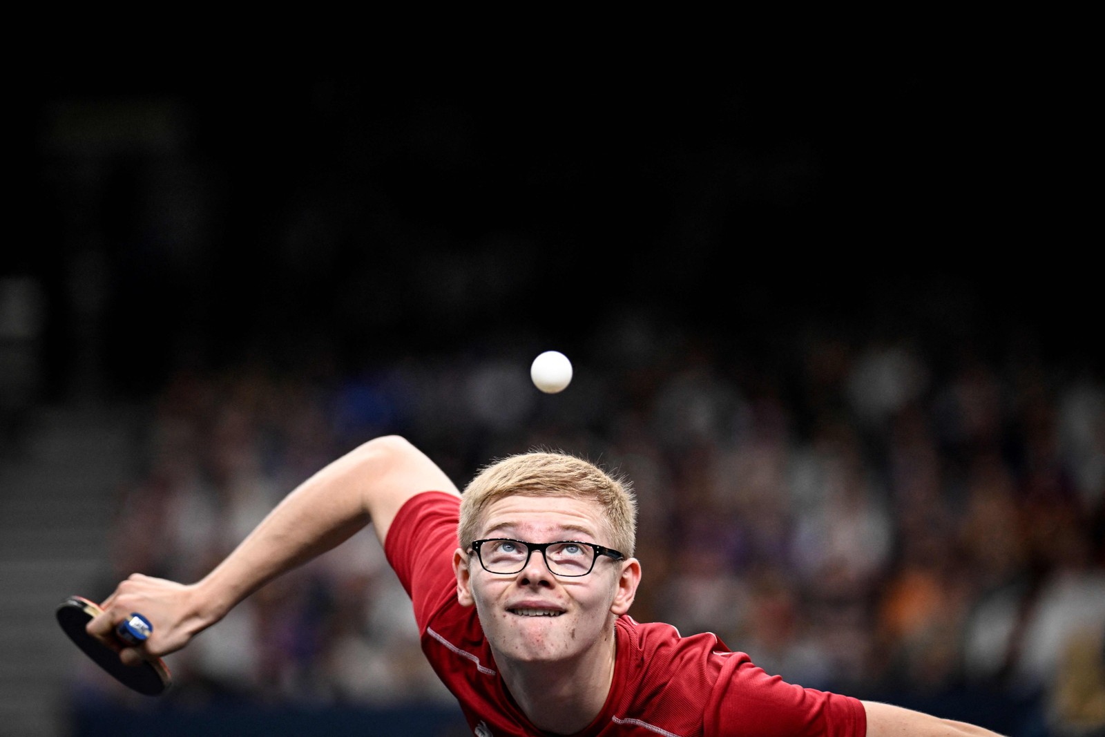 O francês Felix Lebrun em disputa com o indiano Harmeet Desai durante as oitavas de final do tênis de mesa masculino — Foto: WANG Zhao /AFP