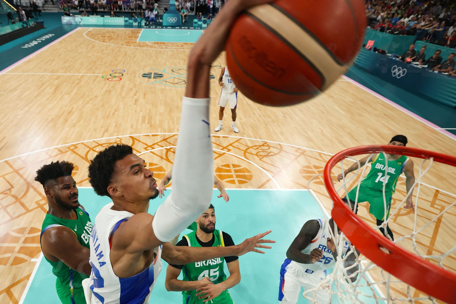 O frances,Victor Wembanyama,durante partida masculina de basquete do grupo B entre França e Brasil — Foto: POOL/AFP