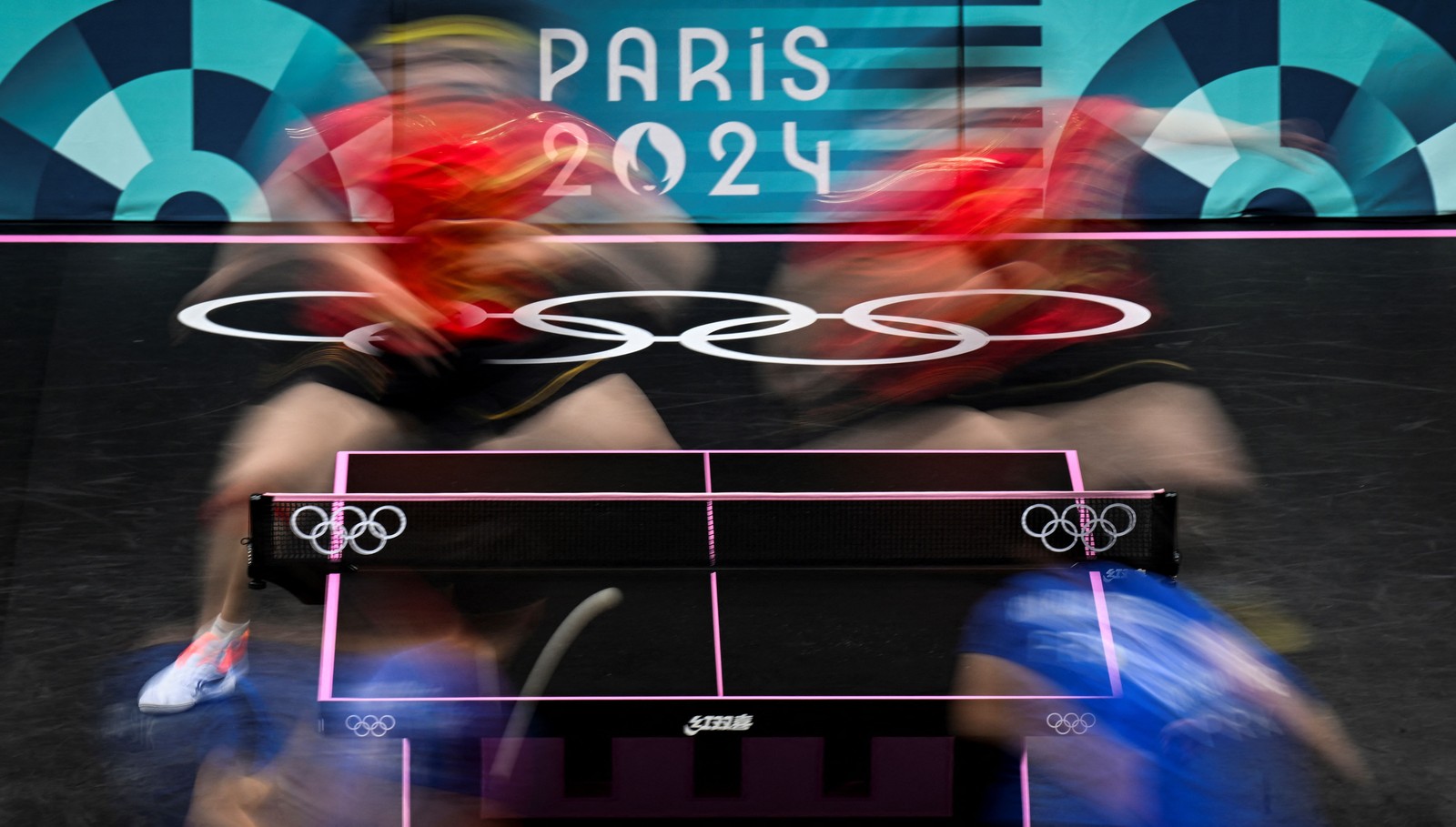 Disputa pela medalha de bronze em duplas no tênis de mesa entre China e Coreia — Foto: WANG Zhao / AFP