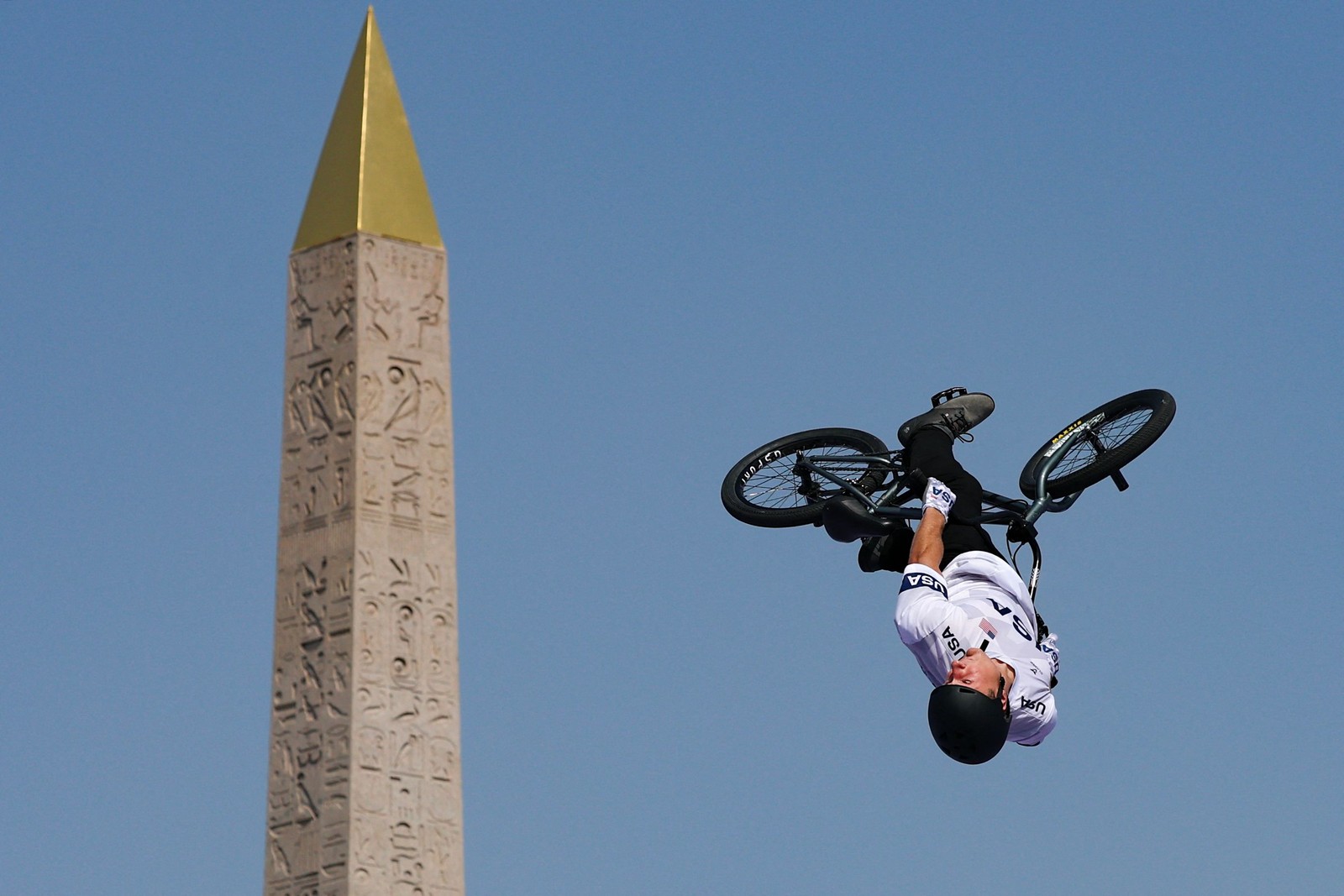 Marcus Christopher,dos EUA,compete na qualificação do Ciclismo Masculino BMX Freestyle Park — Foto: Emmanuel Dunand / AFP