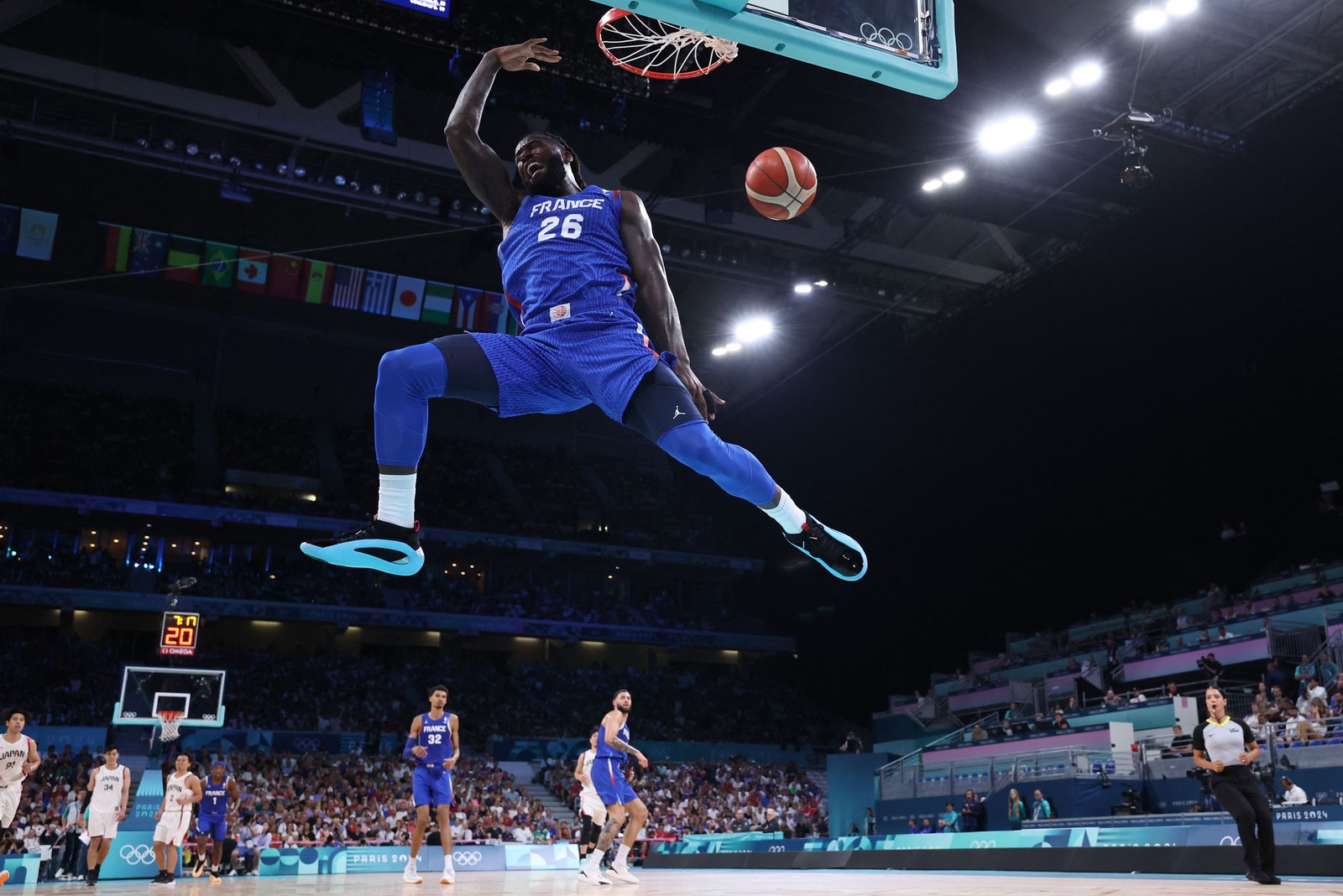 O frances,Mathias Lessort,durante partida de basquete do grupo B entre Japão e França — Foto: Thomas Coex / AFP