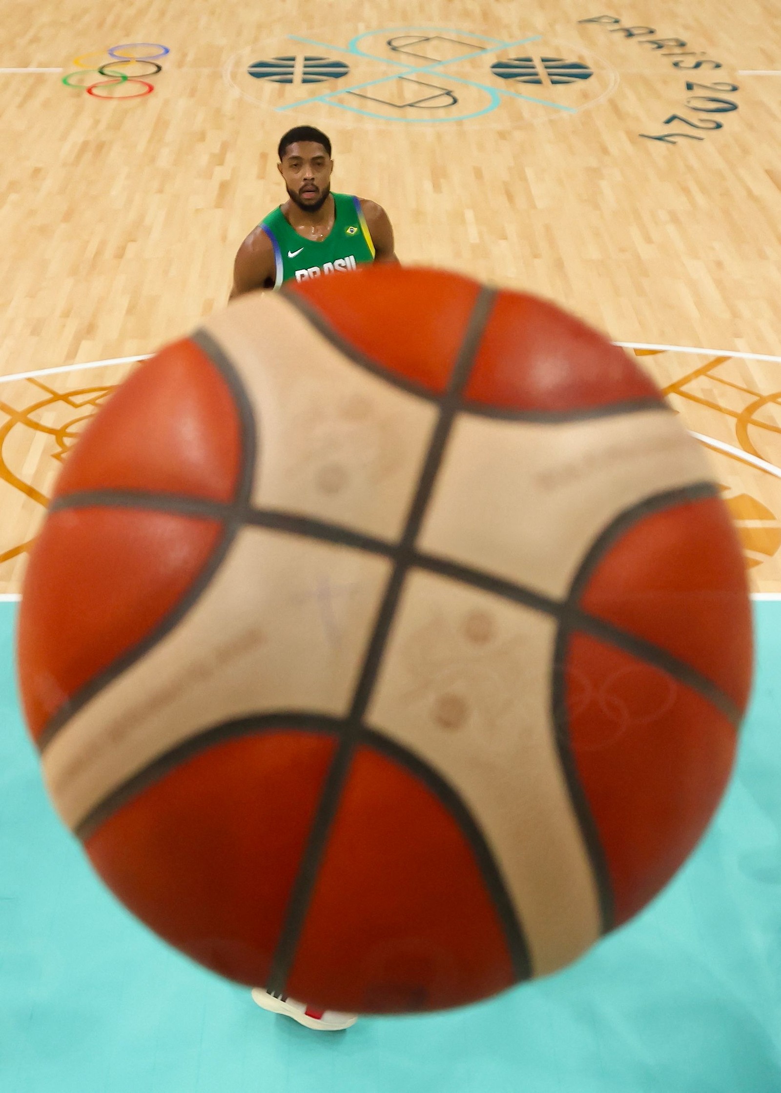 Bruno Caboclo,do basquete masculino do Brasil,em olhada para a bola na fase preliminar do grupo B — Foto: Gregory SHAMUS / AFP