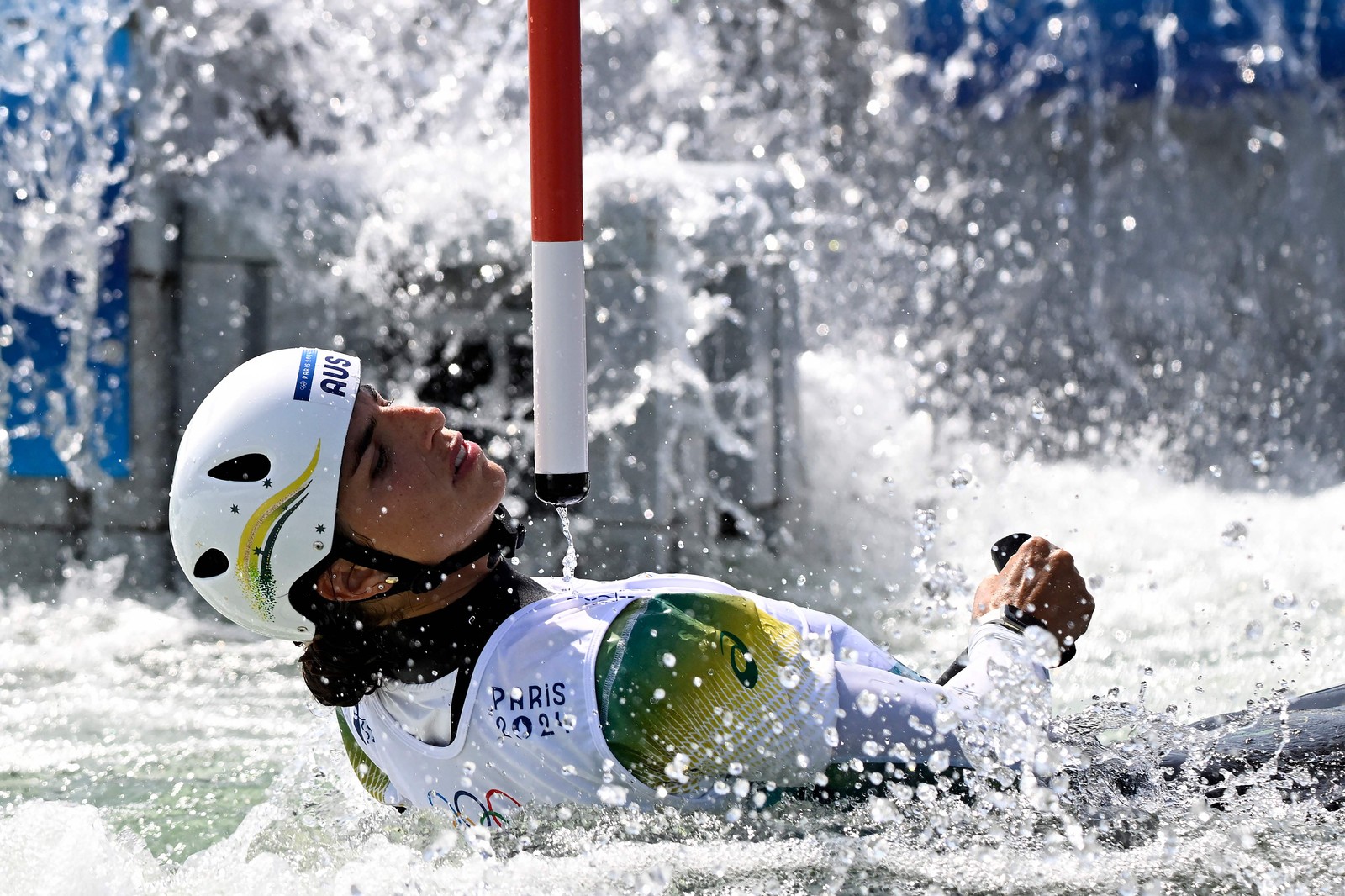 A australiana Jessica Fox durante as eliminatórias individuais femininas de canoagem slalom — Foto: Olivier MORIN / AFP