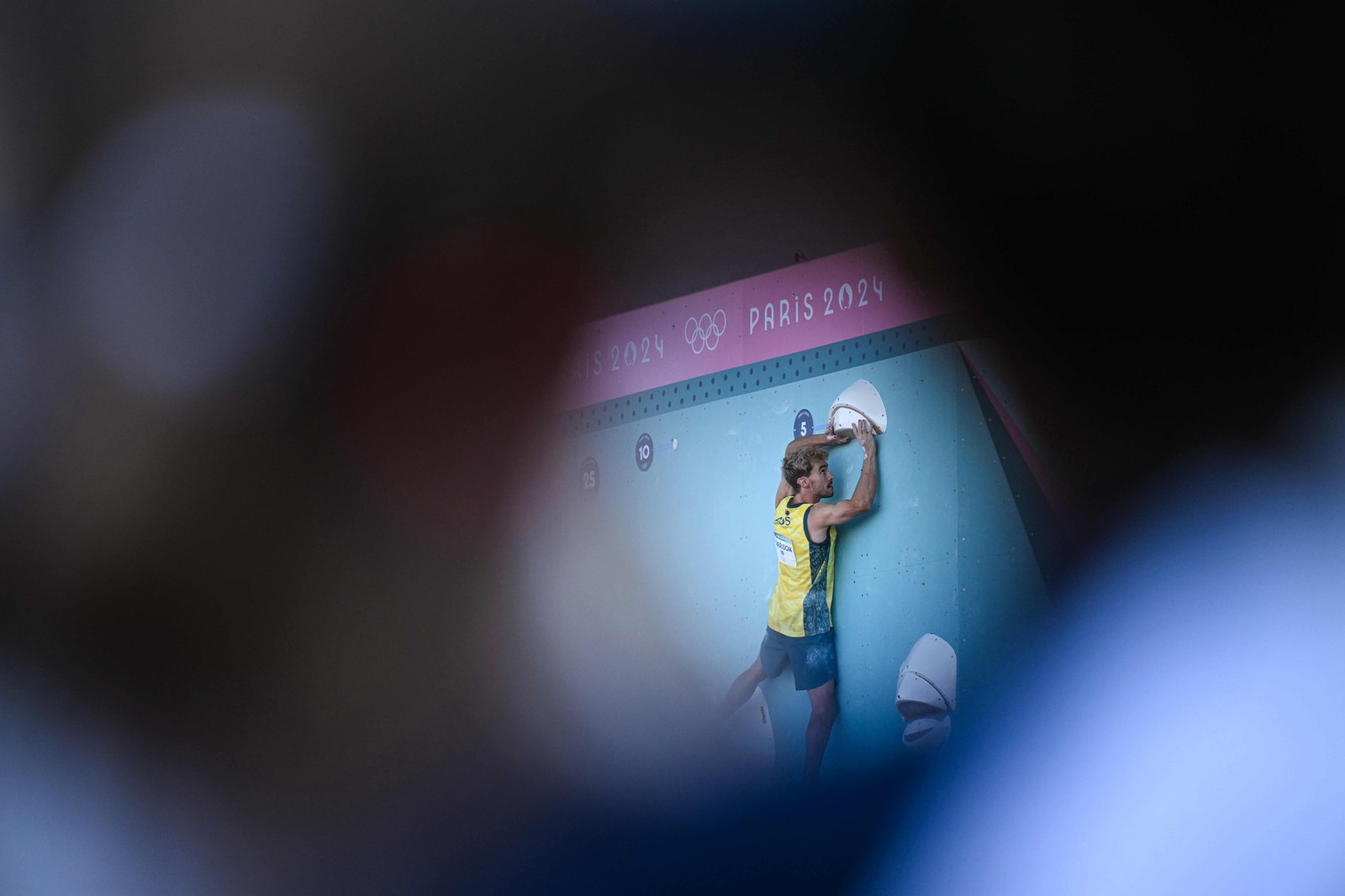 O australiano Campbell Harrison durante a semifinal masculina de escalada esportiva — Foto: Jonathan NACKSTRAND / AFP