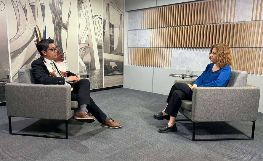 Eloy Terena é entrevistado por Míriam Leitão na GloboNews — Foto: Divulgação RESUMOSem tempo? Ferramenta de IA resume para você
