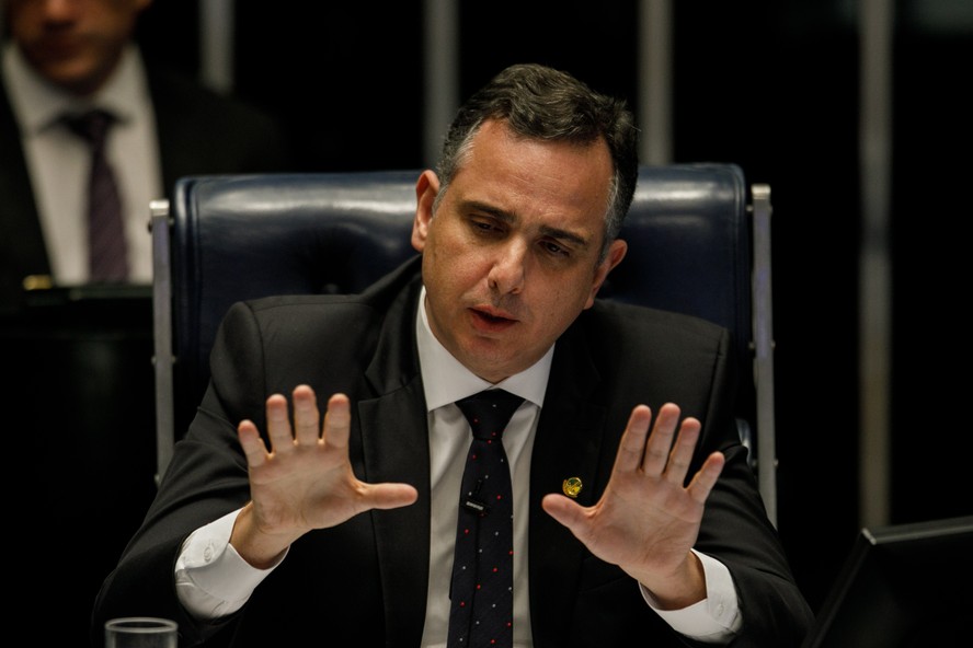 O presidente do Senado,Rodrigo Pacheco,durante votação de projeto de negociação da dívida dos estados — Foto: Brenno Carvalho/Agência O Globo