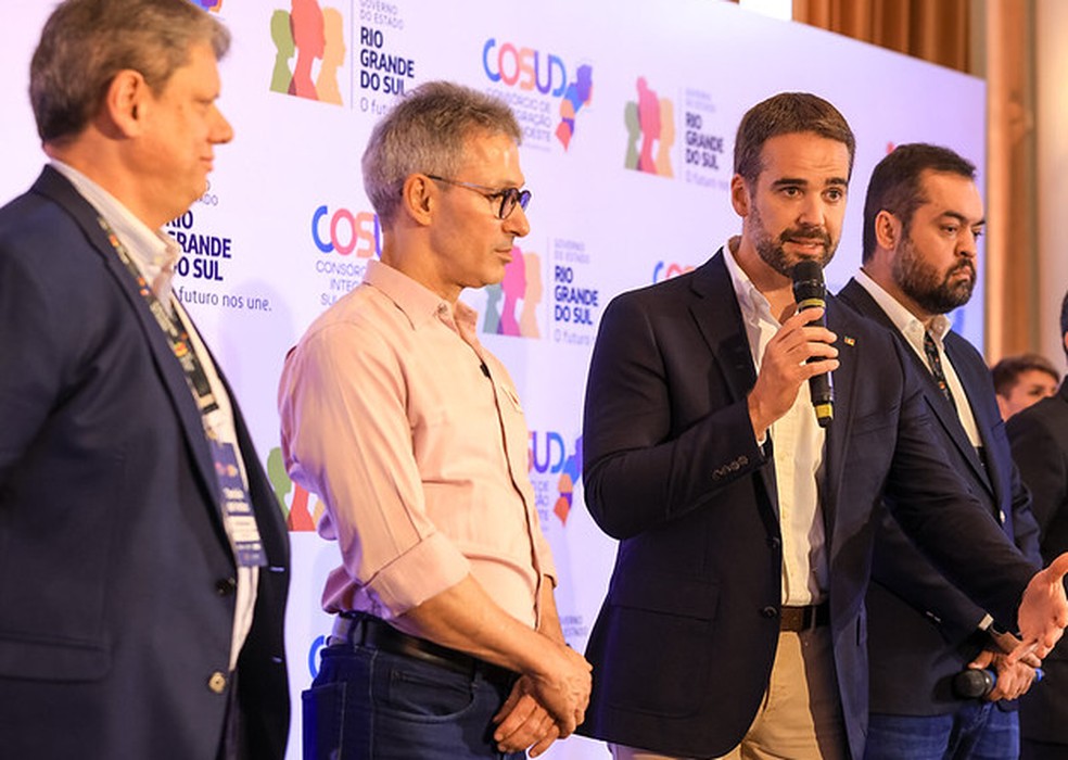 Tarcísio de Freitas (SP),Romeu Zema (MG),Eduardo Leite (RS) e Claudio Castro (RJ),governadores dos estados que concentram a maior parte da dívida de entes federativos com a União — Foto: Gustavo Mansur/ Palácio Piratini