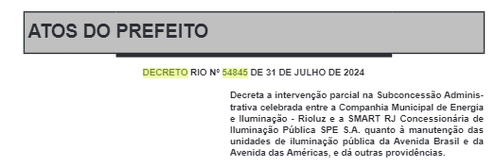 Publicado no dia 31 de julho de 2024,o Decreto 54.845/24 instituiu uma intervenção parcial de até 180 dias em parte da concessão celebrada entre Rioluz e Smart Luz,para “a manutenção das unidades de iluminação pública da Avenida Brasil e da Avenida das Américas”. Segundo a publicação,a medida foi tomada por “deficiência na prestação de serviço” e pelo “não cumprimento de cláusulas contratuais”.