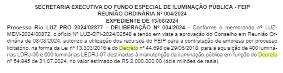 Em uma publicação feita no dia 14 de agosto,a Secretaria Executiva do Fundo Especial de Iluminação Pública (Feip) autorizou a utilização de R$ 2 milhões de seus recursos para a contratação de empresa por processo licitatório e aquisição de 400 luminárias LDRJ-06 e 600 luminárias LEDRJ-07 destinadas à manutenção das vias.