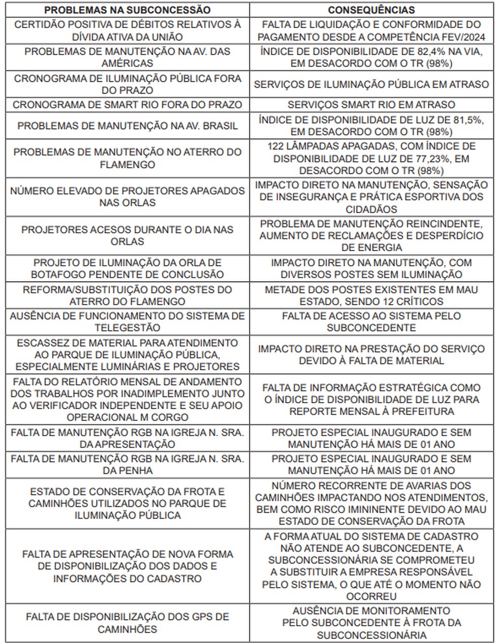 Em 23 de julho,dias antes da publicação do decreto,a Secretaria Municipal de Infraestrutura já havia publicado no Diário Oficial uma notificação extrajudicial solicitando a regularização de 25 pendências apresentadas pela Smart Luz. Entre as demandas estavam problemas encontrados na manutenção da iluminação da Avenida Brasil e da Avenida das Américas.