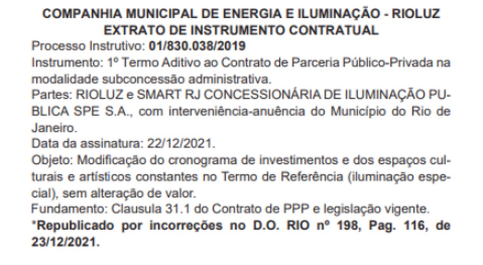 Durante o período de atuação da concessionária,a prefeitura publicou dois termos aditivos ao contrato. O primeiro,publicado em 23 de dezembro de 2021,coloca sob o escopo de trabalho da Smart Luz a administração do projeto de iluminação especial do Sambódromo. Não é especificado na publicação se a alteração afetou o fluxo de caixa e cronograma da licitação.